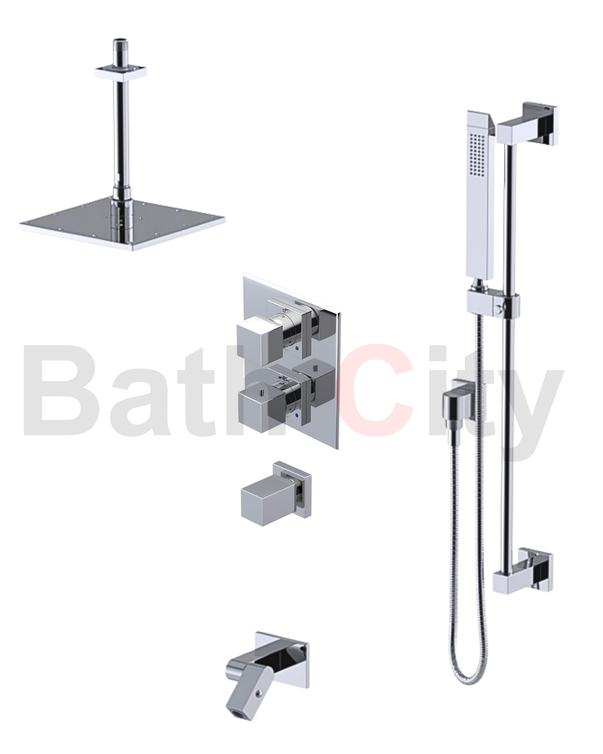 RUBINET 28RSQ Seven Temperature Control Shower with Two Way Diverter & Shut-Off with One Separate Volume Control, Hand Held Shower, Adjustable Slide Bar, Integral Supply, Wall Mount Bidet/Foot Rinse & Fixed Shower Head & Arm/ 8" Ceiling Mount-Trim Only