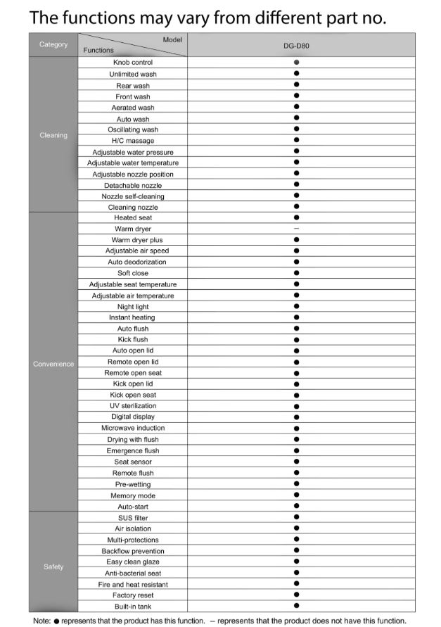 - Automated flush options: Kick flush, Remote Control flush, Emergency flush, Power-off manual toilet flush